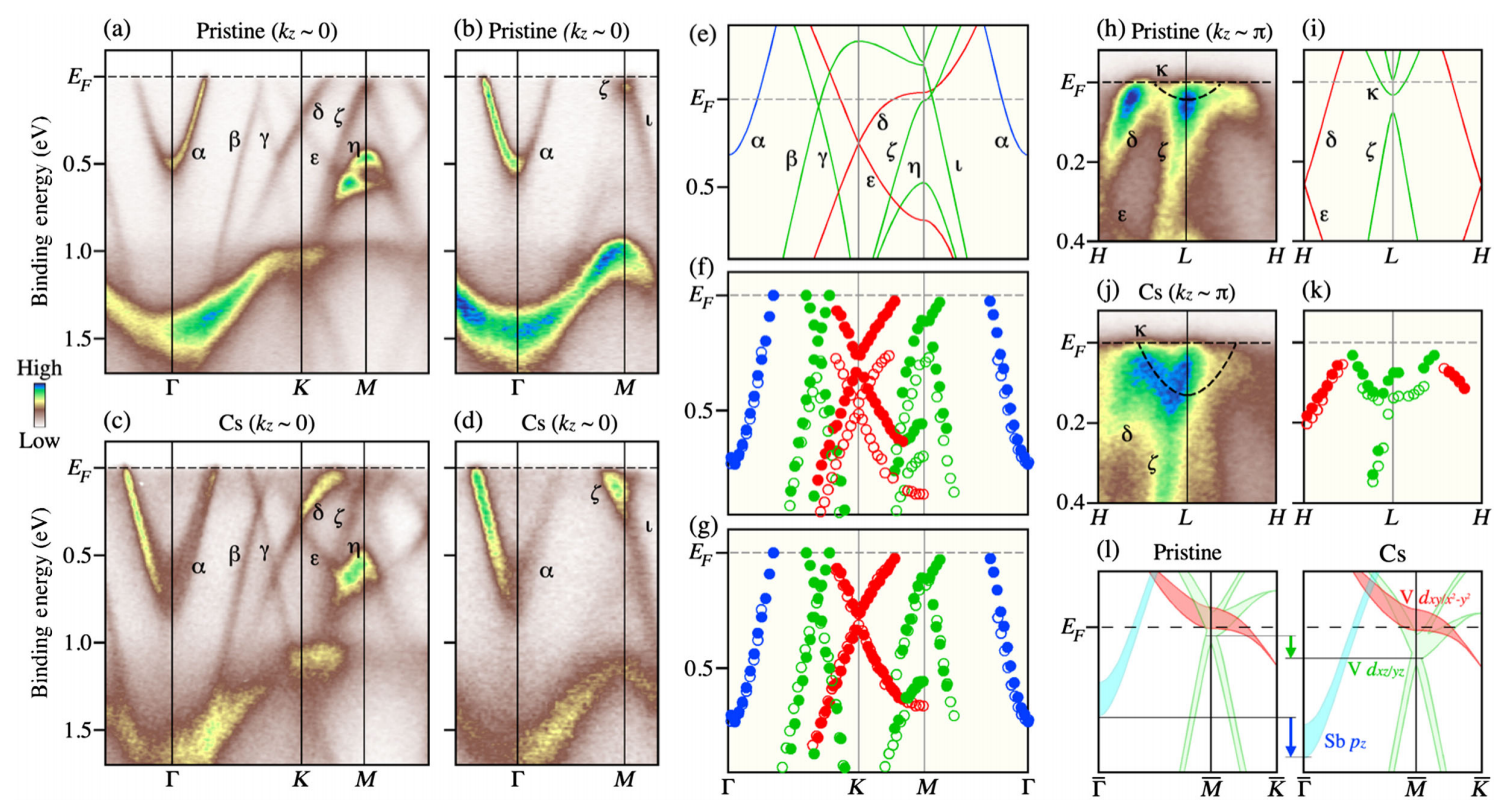 Kagome結構材料中通常會形成平帶、鞍點以及具有線性色散關系的狄拉克點,為了對該體系材料的能帶結構進行全面而深入的研究,研究團隊與日本東北大學的T. Sato課題組一起,利用角分辨光電子能譜(ARPES)研究了CsV3Sb5材料的電子能帶結構及其調控。