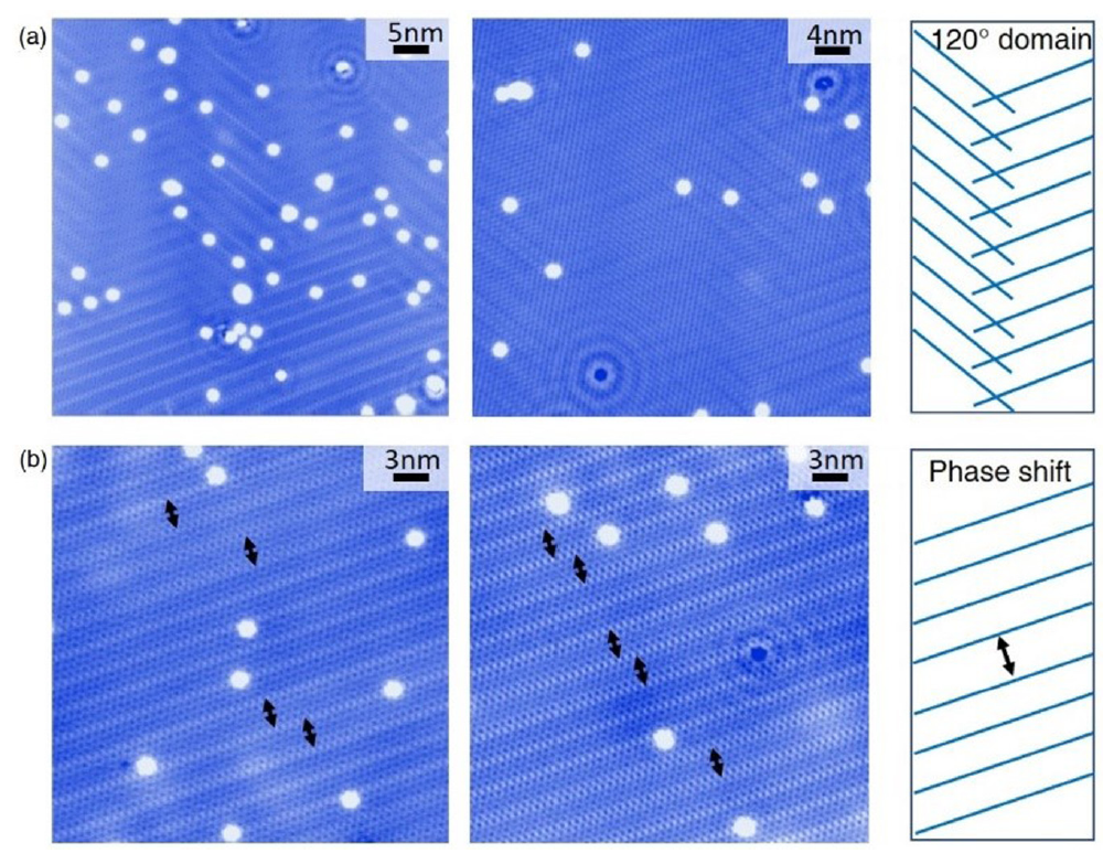 高質量單晶樣品的獲得是開展相關實驗研究的前提,李永愷博士生在王秩偉研究員指導下,經過一系列晶體生長參數調控和優化后,得到了高質量的CsV3Sb5單晶樣品,單晶衍射峰的半高寬只有0.07°。電輸運和磁性測試表明該材料在91K附近存在CDW相變,在3K附近發生超導轉變,同時還觀察到明顯的反常霍爾信號,如圖1所示。進一步與普林斯頓大學M. Z. Hasan團隊等人合作,通過低溫STM測量發現手性電荷序現象,并觀察到了2×2和1×4兩種調制結構,如圖2所示。其中2×2電荷調制結構跟該體系中的CDW緊密相關,而且由電荷序打開的能隙的振幅表現出實空間調制特性,具有2×2的手性特征,這反應了手性電荷序的電子性質。而1×4調制結構形成不同的疇壁,疇壁之間存在120°的固定夾角,如圖3所示。該工作發表在PRB上 [Phys. Rev. B 104, 075148 (2021)],并被選為編輯推薦文章。