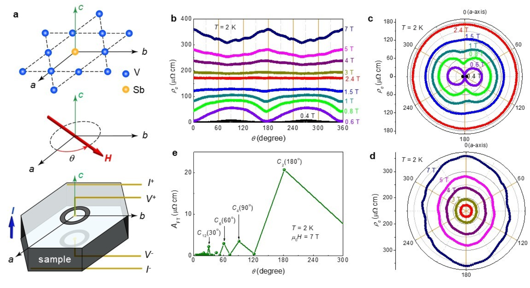 CsV3Sb5材料中CDW的驅動機制及其與超導電性的關系一直是大家關注的焦點,為了研究體系的CDW驅動機制和超導電性,研究團隊跟南京大學聞海虎教授課題組展開合作,首先利用紅外光譜對CsV3Sb5中的CDW進行了深入研究。發現在 T CDW = 91 K以上,該材料低頻的光電導表現出明顯的Drude響應,與該材料的金屬性相符。在 T CDW以下觀察到典型的電荷密度波的光學特征。進一步通過對所有溫度的光電導譜進行Drude-Lorentz擬合,如圖4所示。發現CDW能隙在M點的鞍點處打開,而Γ點附近的電子帶和K點附近的Dirac帶均不受影響。該結果表明,M點處的鞍點通過波矢Q的嵌套可能是CsV3Sb5中電荷密度波的驅動機制。該工作以Letter的形式發表在PRB上[Phys. Rev. B 104, L041101 (2021)],并被選為編輯推薦文章。隨后,他們對CsV3Sb5在c方向的電阻率進行測量(如圖5所示),電流沿著c方向并始終垂直于磁場,磁場平行于ab面并在面內旋轉。可以看出不同磁場條件下的電阻率隨角度的變化曲線存在明顯的二重對稱性,破壞了晶體結構的面內六重(或三重)對稱性。在外加磁場小于2.4 T(對應超導態)和大于2.4 T(對應正常態),電阻率極小值對應的磁場方向相互垂直,說明超導態和正常態二重對稱性相互垂直。進一步研究了這兩種二重對稱性隨溫度的變化關系,結果如圖6所示。可以看到,低磁場下超導態對應的電阻二重對稱性在超導轉變溫度附近迅速消失,而高磁場下正常態測量到的二重對稱性隨著溫度升高減弱,并在CDW轉變溫度附近消失,這些結果大大豐富了人們對這一籠目結構超導材料及其物性的認識。相關結果發表在NC上[ Nat. Commun. 12, 6727 (2021)]。