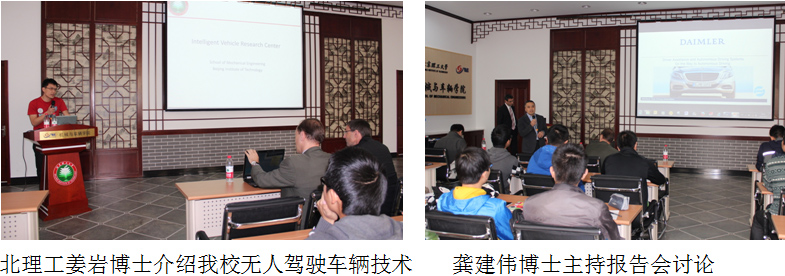 2014年4月14日上午,德國梅賽德斯-奔馳自動(dòng)駕駛研發(fā)部門高經(jīng)理Eberhard Zeeb博士、北京理工大學(xué)機(jī)械與車輛學(xué)院龔建偉博士和姜巖博士就無人駕駛技術(shù)進(jìn)行技術(shù)交流聯(lián)合報(bào)告,奔馳公司中國研究發(fā)展部高級經(jīng)理Klaus Hermann博士和助理經(jīng)理?xiàng)瞰h女士、北京理工大學(xué)高利教授等參加研討和交流,北京理工大學(xué)與無人駕駛車輛研究相關(guān)的教師和研究生五十多人參加了技術(shù)交流報(bào)告會(huì)。