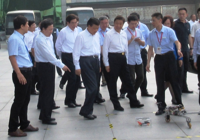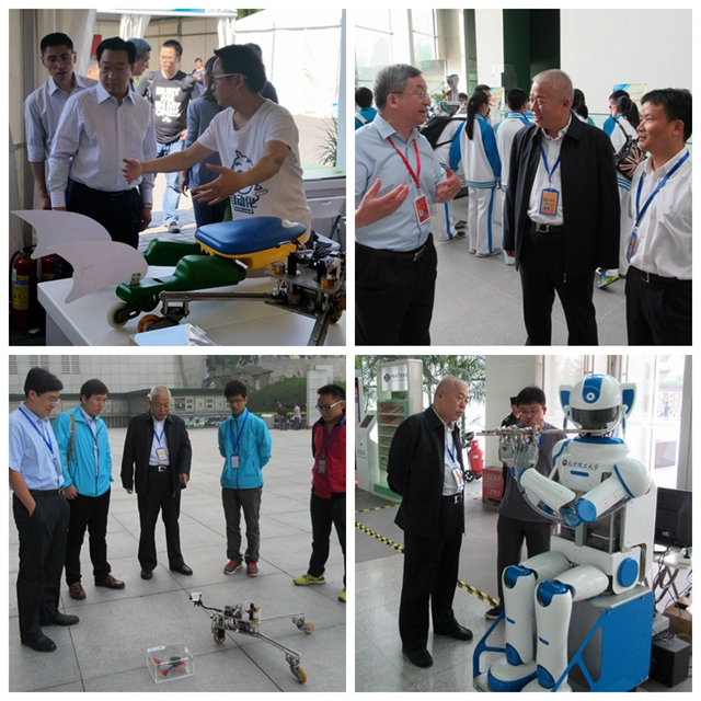 上午9時許,中央政治局常委、中央書記處書記劉云山,中央政治局委員、中央書記處書記、中央宣傳部部長劉奇葆,中央政治局委員、國家副主席李源潮,中央政治局委員、北京市委書記郭金龍,十二屆全國政協副主席、九三學社中央主席、中國科學技術協會主席韓啟德等中央領導來到我校展臺前,分別聽取了機電學院黃強教授和自動化學院楊毅副教授的介紹,饒有興趣的觀看了機器人的表演,對我校師生的作品表示了充分的肯定。