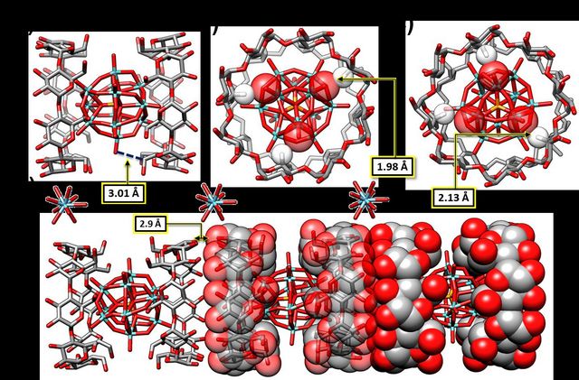 Sir J. Fraser Stoddart教授在有機(jī)化學(xué)和超分子化學(xué)等領(lǐng)域做出了令世界矚目的杰出貢獻(xiàn),也是著名的環(huán)糊精化學(xué)方面的科學(xué)家。李暉教授在功能配合物的設(shè)計(jì)、制備、結(jié)構(gòu)與性質(zhì),以及新型化合物和較復(fù)雜體系的結(jié)晶學(xué)的研究領(lǐng)域具有深厚的研究基礎(chǔ)。兩人的合作一舉攻克了這一難題。開創(chuàng)性地運(yùn)用超分子自組裝的方法,在溫和、環(huán)境友好的合成條件下將[PMo12O40]3+與β-環(huán)糊精和γ-環(huán)糊精分別組裝成為晶態(tài)有機(jī)-無機(jī)雜化材料,并運(yùn)用X-射線單晶衍射法對兩種雜化材料的晶體結(jié)構(gòu)進(jìn)行了詳細(xì)的分析。圖2展示了γ-環(huán)糊精與雜多金屬氧簇[PMo12O40]3+形成的有機(jī)-無機(jī)雜化材料的晶體結(jié)構(gòu)圖。運(yùn)用同步輻射小角和廣角X射線散射(SAXS/WAXS)技術(shù)以及核磁共振譜學(xué)方法(1H NMR)對溶液中的自組裝過程進(jìn)行了研究;對材料的部分性質(zhì)進(jìn)行了初步的探索。該研究開辟了環(huán)糊精-多金屬氧簇(CD-POM)雜化材料的新研究領(lǐng)域。可以預(yù)期:這類新雜化材料將在催化,光催化和生物醫(yī)藥等領(lǐng)域具有重要的應(yīng)用。