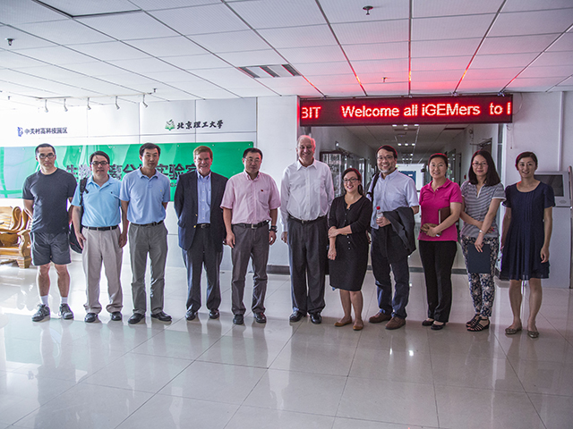 李勤副院長代表生命學(xué)院說明了學(xué)校教務(wù)處、研究生院對(duì)我校iGEM參賽隊(duì)的大力支持,各位指導(dǎo)老師就iGEM的現(xiàn)今狀況和未來發(fā)展展開了熱烈的討論。北理工兩支參賽隊(duì)BIT-China和BIT的學(xué)生代表李晨翊、李逸飛等同學(xué)依次向與會(huì)者介紹了我校iGEM的組織方式及我校自2013年以來參加iGEM競賽所取得成績和收獲。Randy對(duì)我校在合成生物學(xué)領(lǐng)域取得的成就表示了肯定,對(duì)我校iGEM隊(duì)伍的發(fā)展和取得的成績給予了很高評(píng)價(jià)。Randy也真誠地祝愿北京理工大學(xué)兩支iGEM代表隊(duì)在今年的大賽中再創(chuàng)佳績,并希望中國在合成生物學(xué)領(lǐng)域取得長足發(fā)展。會(huì)議結(jié)束后,生命學(xué)院鄧玉林院長和李春教授分別向Randy一行介紹了生物分離分析實(shí)驗(yàn)室和生物轉(zhuǎn)化實(shí)驗(yàn)室在生物技術(shù)研究領(lǐng)域的概況。