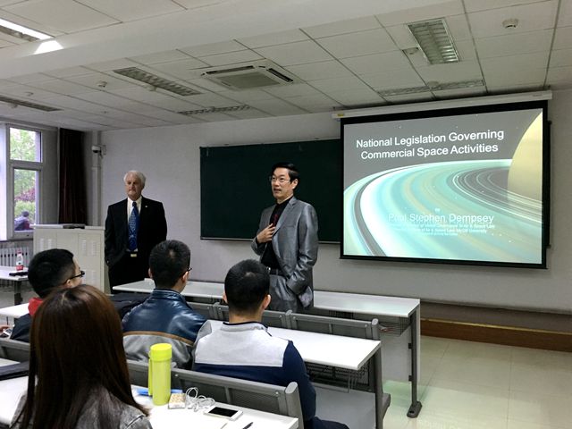 2016年4月14日18點30分,在北京理工大學研究生樓104室,Paul Stephen Dempsey教授為2014級和2015級國際法研究所的研究生帶來了一場主題為“National Legislation Governing Commercial Space Activities”的精彩講座。