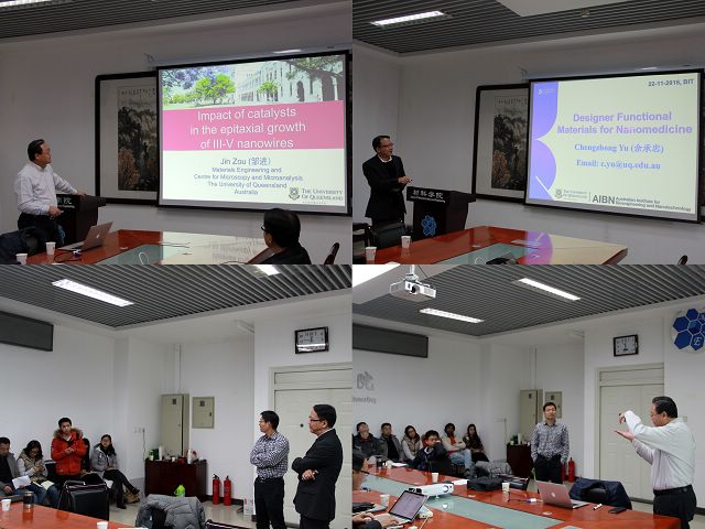 論壇共分為兩部分:11月21日在中關村校區國際教育交流大廈三層第三會議室舉行大會報告;11月22日在中關村校區5號樓502報告廳舉行專題學術講座。出席論壇的有:澳大利亞昆士蘭大學Xiusong Zhao教授、Jin Zou教授、Chengzhong Yu教授、Steven Pratt博士和Ashok Kumar博士以及北京理工大學材料學院的曹傳寶教授、張加濤教授、陳棋教授、鐘海政教授以及聯合中心部分老師和學生代表。