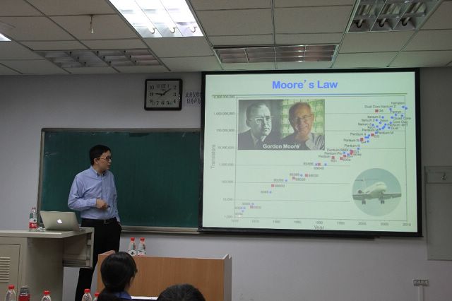 段鑲鋒教授首先從半導(dǎo)體技術(shù)的發(fā)展出發(fā)指出技術(shù)革新對材料性能的特殊要求,提出二維材料的一些優(yōu)異性能可彌補(bǔ)目前主流硅材料的瓶頸。隨后以石墨烯和二硫化鉬材料為例,提出了通過范德華作用力對材料進(jìn)行有效集成的概念,介紹了近年來其課題組在該研究領(lǐng)域的一些極富創(chuàng)新性的研究工作。同時(shí)段教授也介紹了課題組在新型納米器件結(jié)構(gòu)設(shè)計(jì)、二維材料在光電納米器件中的應(yīng)用等方面做的創(chuàng)新成果。整個(gè)報(bào)告過程中,段教授邏輯嚴(yán)謹(jǐn),深入淺出的講解了他們在這一領(lǐng)域的研究思路和成果。