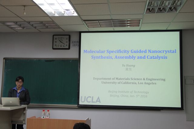 黃昱教授的報(bào)告同樣精彩。她首先提出將生物仿生方法運(yùn)用到納米晶體形貌可控制備中的概念,通過噬菌體展示技術(shù)篩選出與靶向材料表面甚至特定晶面有特異吸附作用的生物分子,并利用篩選出的生物分子對納米晶的生長進(jìn)行精確調(diào)控進(jìn)而控制納米晶體的形貌,通過這種方法可以設(shè)計(jì)并合成具有高催化活性的催化劑。此外,黃昱教授進(jìn)一步闡述通過組分和表面調(diào)控以獲得高活性的催化劑的方法和機(jī)理。黃昱又對該研究方向未來的發(fā)展、機(jī)遇和挑戰(zhàn)進(jìn)行了展望,并與在場師生進(jìn)行了熱烈的討論交流。段、黃兩位教授的到訪,對北理工材料相關(guān)領(lǐng)域的國際化交流起到了很大的推動作用,也為UCLA和北京理工大學(xué)的文化學(xué)術(shù)交流建起了一座溝通的橋梁。