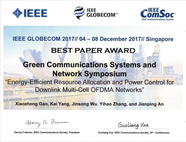 IEEE GLOBECOM是世界通信行業的兩大頂級會議之一,是世界通信行業規模最大、最具影響力的標志性學術會議,于每年12月中旬定期召開。會議涵蓋了信息論、認知無線電技術、網絡安全、無線通信網絡、光通信網絡、大數據、云計算、綠色通信、物聯網等在內的通信行業的各個領域。IEEE GLOBECOM的最佳論文獎是通信學術界的頂級大獎之一,該獎項長期被歐美頂尖學府壟斷。本次大會從2600余篇投稿中,根據研究領域評選出了15篇最佳論文,安建平教授團隊的論文獲得了綠色通信系統與網絡唯一的最佳論文獎,這是我校首次獲此殊榮。