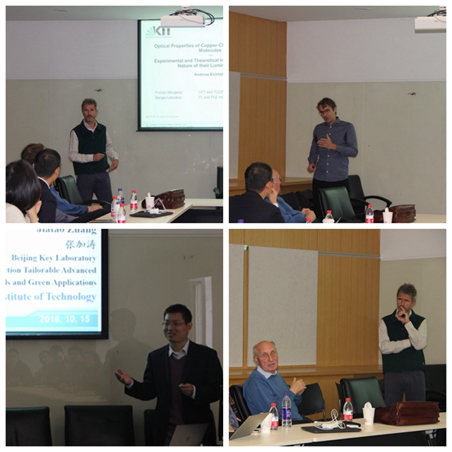 應材料學院結構可控先進功能材料與綠色應用北京市重點實驗室,北理工—昆士蘭能源材料聯合研究中心主任張加濤教授的邀請,德國科學院院士卡爾斯魯厄理工大學Dieter Fenske教授、Andreas Eichhoefer研究員、德國馬爾堡菲利普斯大學Robert Langer教授于2018年10月15日至18日來北京理工大學材料學院進行學術交流。