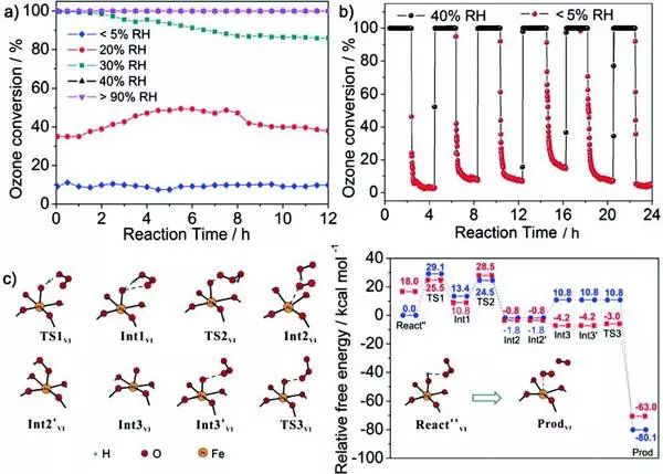 (a)分別在<5%RH、20%RH、30%RH、40%RH和> 90%RH下MIL-100(Fe)的臭氧轉(zhuǎn)化率。b)在交替相對濕度下MIL-100(Fe)上的臭氧轉(zhuǎn)化率。c)優(yōu)化了在MIL‐100(Fe)催化臭氧分解過程中沿路徑穩(wěn)定點(diǎn)的結(jié)構(gòu)和相應(yīng)的勢能曲線。藍(lán)色和紅線分別表示六重態(tài)和四重態(tài)MIL-100(Fe)氫氧化物復(fù)合物的能級。實(shí)驗條件:用0.27g石英砂稀釋0.03g催化劑, C( O3)= 45ppm,流速="1000mL" min-1,RH="45%,室溫。)
