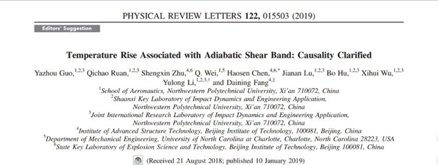 2019年1月11日,物理學(xué)頂級期刊《物理評論快報》(Physical Review Letters)在線報道了西北工業(yè)大學(xué)、北京理工大學(xué)(共同完成單位)聯(lián)合研究成果。在方岱寧院士、李玉龍教授的指導(dǎo)下,郭亞洲副教授(第一作者)、陳浩森副教授(共同通訊作者)、朱盛鑫博士和阮啟超碩士等開展了絕熱剪切帶的產(chǎn)生和溫度之間的因果關(guān)系研究 (Temperature Rise Associated with Adiabatic Shear Band: Causality Clarified),這篇文章主編被選為“Editor’s Suggestion” 。