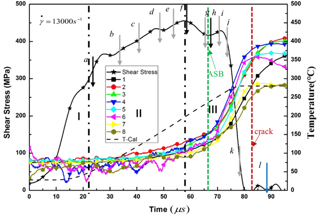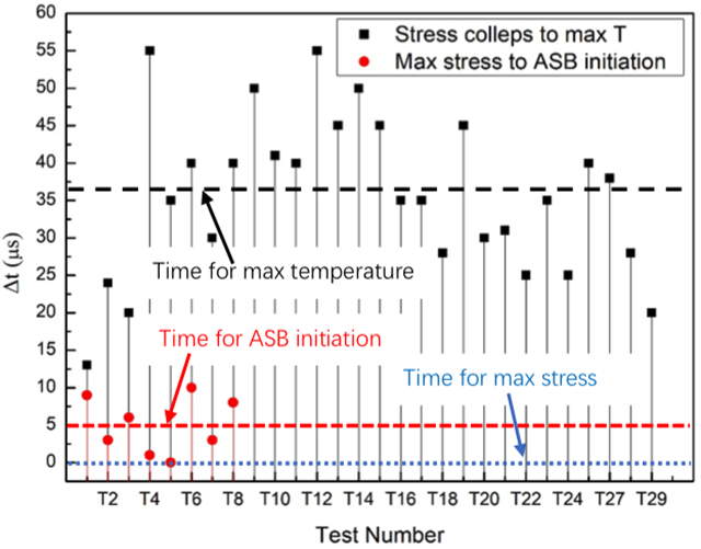 圖4給出了絕熱剪切局部化過程中典型事件發(fā)生時刻的相對關(guān)系。絕熱剪切帶的萌生時刻出現(xiàn)在最大應(yīng)力時刻點之后。實驗結(jié)果意味著基于熱-塑性失穩(wěn)的臨界準則預(yù)測的臨界剪切應(yīng)變可能會偏小。絕熱剪切帶萌生時刻的溫度大約50-90?C,導(dǎo)致的應(yīng)力下降30-54MPa。同時,變形區(qū)域的溫度分布表明材料沒有出現(xiàn)局部化的熱軟化。此外,由于應(yīng)變率硬化使得材料的應(yīng)力增大了50-60MPa。因此,熱軟化效應(yīng)不足以促使應(yīng)力的陡降或絕熱剪切帶的萌生。當(dāng)絕熱剪切帶萌生后的30μs,溫度達到最大值。溫度的快速上升可以認為是絕熱剪切帶形成和傳播導(dǎo)致的。同時,通過分析高速相機獲得變形過程,可以知道絕熱剪切帶完全傳播到整個試樣的時間小于10μs。因此,更大局部變形促進絕熱剪切帶的發(fā)展,更帶來了局部更高的溫度。如將絕熱剪切局部化過程中的典型事件按照時間先后排序:應(yīng)力峰值-絕熱剪切帶萌生-絕熱剪切帶傳播/溫度上升-最大溫度/宏觀裂紋。絕熱剪切帶萌生后的溫度上升意味著溫升不是觸發(fā)絕熱剪切帶形成的原因,而是絕熱剪切局部化導(dǎo)致了溫度的上升。傳統(tǒng)的絕熱剪切帶熱軟化機理應(yīng)該需要被重新認識。