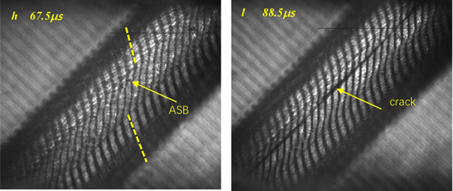 在沖擊載荷下,絕熱剪切帶被認為是材料失效的重要機理之一。自從Zener和Hollomon提出絕熱剪切局部過程是一種熱-塑性失穩(wěn)后,許多研究者認為絕熱剪切帶是由于材料熱軟化與應(yīng)變/應(yīng)變率硬化之間的競爭導(dǎo)致的。此外,剪切帶內(nèi)的材料再結(jié)晶表明絕熱剪切帶形成伴隨著溫度上升。因此,目前大部分學(xué)者認為溫度上升是導(dǎo)致絕熱剪切帶形成的主要因素。然而,這一普遍接受的認識還未得到實驗驗證,主要由于兩方面難題亟待解決:一是絕熱剪切對測溫儀器提出“兩高一寬”的要求,即高時間分辨(微秒級)、高空間分辨(十微米級)、寬測溫區(qū)間(近千度);另一方面,需要搭建微秒級同步紅外測溫和光學(xué)測變形的實驗平臺,才能揭示絕熱剪切帶形成和溫度升高兩者之間的因果關(guān)系。