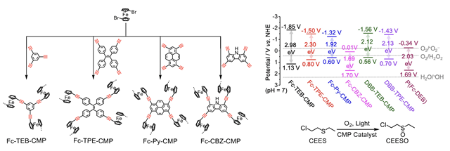 水污染等環境問題是當今社會面臨的一大挑戰,通過光催化反應對污染物進行高級氧化降解有望成為一種更加高效、節能的污染物處理方法。王博、馮霄團隊通過三鍵聚合反應構筑了系列基于二茂鐵基元的共軛微孔聚合物(Fc-CMPs)用于有毒有害物質降解研究。Fc-CMPs具有較大的孔徑和比表面積,使得污染物容易進入孔道進行預富集并可充分接近易發生氧化還原反應的內表面,同時Fc-CMPs合適的分子軌道能級使得這類材料可高效產生活性氧物種。在可見光和模擬太陽光下,Fc-CMPs光催化降解亞甲藍的能力均優于二氧化鈦 (P25),并且能夠將化學戰劑芥子氣模擬物(2-氯乙基乙基硫醚)完全轉化為無毒產物。該研究工作發表在德國應用化學上( Angew. Chem. Int. Ed. , 2019, DOI: 10.1002/anie.201813598),文章第一作者為博士生馬麗,通訊作者為王博和馮霄。