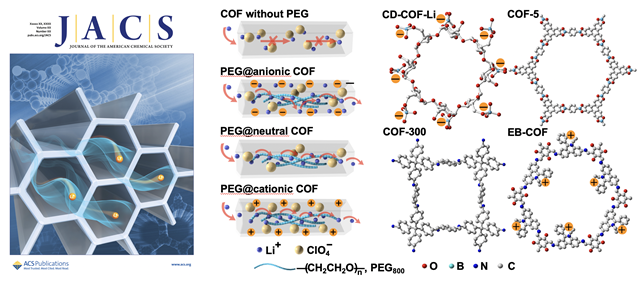 在前期工作中( Angew. Chem. Int. Ed., 2017, 56 , 16313,第一作者為博士生張媛媛,通訊作者為馮霄),該團隊曾成功開發出基于環糊精的三維共價有機骨架材料(CD-COFs),該系列COFs為首次利用柔性基元構筑的具有 rra 拓撲學結構并通過離子型硼元素連接的三維COFs材料。其中,CD-COF-LiéLiPF6-EC-DMC的室溫鋰離子電導率可以達到2.7 mS cm-1。然而,其中殘留的微量電解液可能會在實際應用過程中帶來一定的安全隱患。為解決這一問題,該團隊將低分子量聚乙二醇(PEG)裝載入COF孔道中加速鋰離子傳導,制備出沒有溶劑殘留的全固態電解質,并系統性研究了COF骨架電荷對于鋰離子傳導行為的影響,實現大于0.6的鋰離子遷移數以及120 °C 下1.8 mS cm?1的離子傳導速率。這一簡單的通過擔載PEG加速離子傳導并提高工作溫度范圍的策略為將多孔材料進一步應用于全固態電池領域提供了可能。該研究工作發表在美國化學會志上,并被選為封面文章( J. Am. Chem. Soc. , 2019, 141, 1923),文章第一作者為碩士生郭振彬和博士生張媛媛,通訊作者為王博和馮霄。