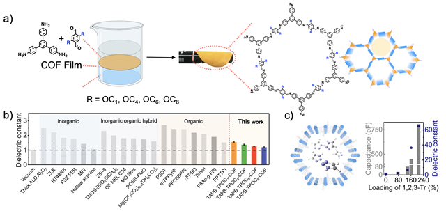 有機多孔材料大多不溶不熔,為其進一步器件化等實際應用帶來了巨大挑戰。該團隊在前期大量成膜化研究基礎上,成功利用液液界面成膜法開發了具有不同長度烷氧基鏈修飾的系列COF薄膜材料,并對其介電常數等相關性質進行了研究。該系列柔性的COF膜具有接近于空氣的介電常數值(在105 Hz下, κ = 1.19 ± 0.04),可媲美目前已報道的無機多孔材料,并且這類COF薄膜材料表現出較好的機械性能、低介電損耗、高擊穿電壓、低漏電流、高抗濕度和抗彎折能力。低介電常數材料被廣泛應用于電子電路器件中的絕緣層,用于減少信號延遲、串擾噪聲和能量耗散。除此之外,高介電常數材料可以應用于場效應晶體管的柵極和電容器當中,該團隊還利用COF薄膜裝載小分子極性化合物,可將其介電常數提升43倍。該研究工作發表在德國應用化學上( Angew. Chem. Int. Ed. , 2018, 57, 16501),文章第一作者為博士生邵鵬鵬、李婕,通訊作者為王博和馮霄。