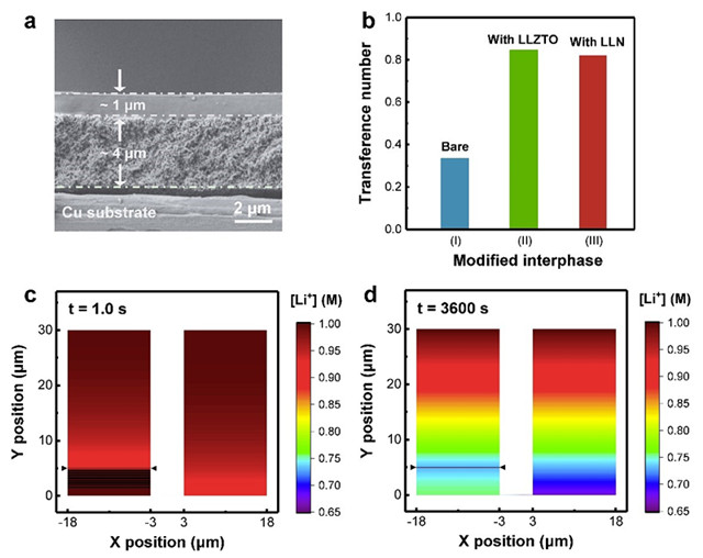 作者通過(guò)遷移數(shù)的測(cè)試,定量證明了該LLN保護(hù)層具有高達(dá)0.82的鋰離子遷移數(shù)(不含LLN層時(shí)僅為0.33)。結(jié)合有限元模擬可直觀(guān)發(fā)現(xiàn)在引入了單離子界面后,鋰離子濃度梯度的堆積得到顯著緩解,這一行為對(duì)于后續(xù)的金屬鋰規(guī)則沉積具有重要意義(圖2)。