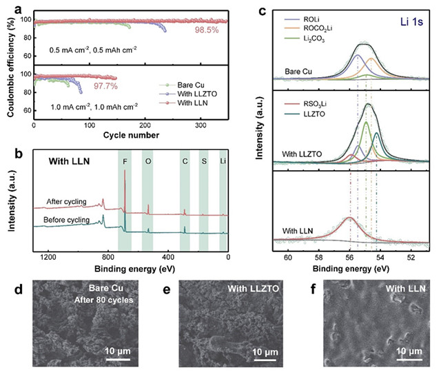 在結(jié)構(gòu)方面,該無(wú)機(jī)-有機(jī)雙層構(gòu)型展現(xiàn)出獨(dú)特的穩(wěn)定性。基于Li-Cu半電池的電化學(xué)測(cè)試中,LLN膜保護(hù)的電極在0.5 mA cm-2和1.0 mA cm-2下分別具有高達(dá)98.5%和97.7%的庫(kù)倫效率。將1.0 mA cm-2下循環(huán)多圈的電極表面進(jìn)行XPS與掃描電鏡表征,發(fā)現(xiàn)具有該雙層構(gòu)型的界面膜保持著良好的原始形態(tài),未探測(cè)到SEI或金屬鋰的信號(hào)。該優(yōu)異的結(jié)構(gòu)穩(wěn)定性是維持長(zhǎng)效金屬鋰保護(hù)的重要保障。