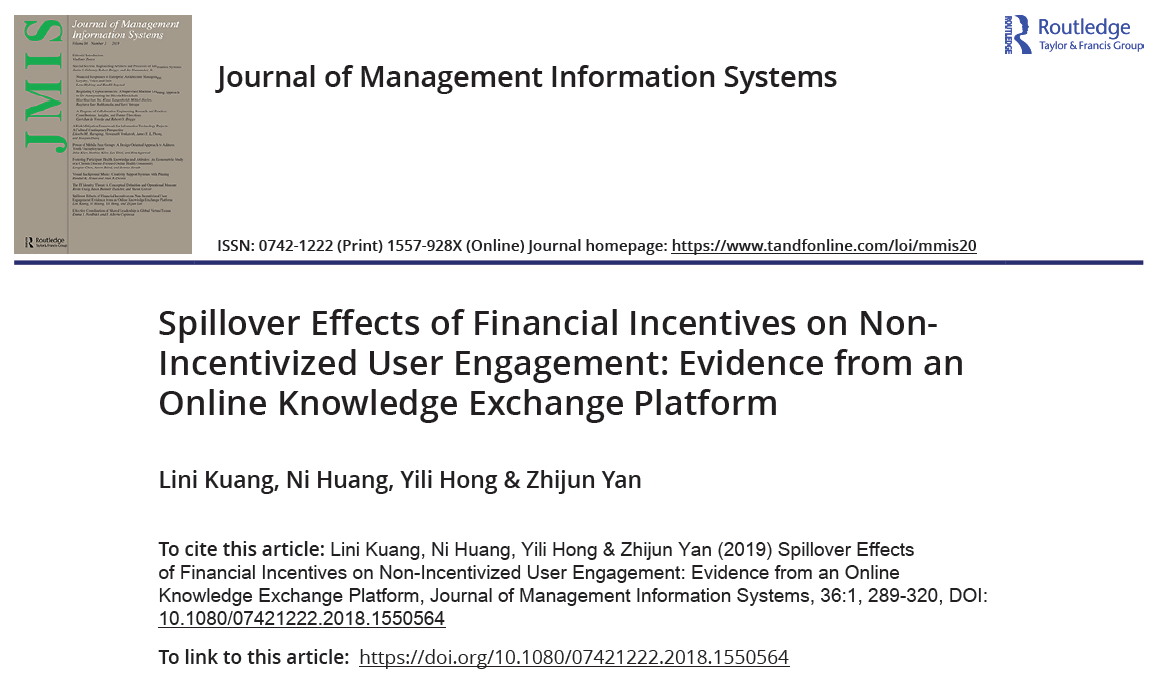 Lini Kuang, Ni Huang, Yili Hong & Zhijun Yan (2019) Spillover Effects of Financial Incentives on Non-Incentivized User Engagement: Evidence from an Online Knowledge Exchange Platform, Journal of Management Information Systems, 36:1, 289-320, DOI: 10.1080/07421222.2018.1550564