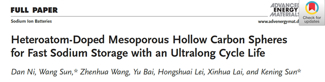 文章詳情: Dan Ni, Wang Sun*, Zhenhua Wang, Yu Bai, Hongshuai Lei, Xinhua Lai, Kening Sun*. Heteroatom‐Doped Mesoporous Hollow Carbon Spheres for Fast Sodium Storage with an Ultralong Cycle Life. Advanced Energy Materials(DOI: 10.1002/aenm.201900036).