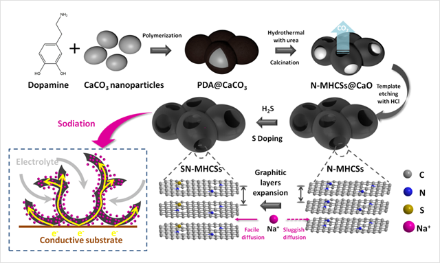 基于以上材料設計思路,孫克寧團隊基于聚多巴胺表面涂覆技術及雜原子摻雜碳結構調控方法,制備了鈉離子電池負極材料——硫氮共摻雜的介孔中空碳球(SN-MHCSs),并對其儲鈉機制及循環后碳結構變化進行了分析。該研究表明:1.薄壁中空球形結構,有利于離子和電子傳導,能夠緩沖充放電過程中的體積變化,碳球表面的介孔結構,能夠促進電解液的擴散及碳球內表面的利用,較高的比表面積可以確保表面電容過程控制的快速鈉儲存。2.雜原子摻雜,能夠增大碳層層間距,促進鈉離子的擴散及存儲,增加電子導電性,提升容量。3.循環過程中,鈉離子的嵌入脫出能夠擴大碳層間距,使碳層排布更加整齊,促進鈉離子及電子的傳輸,帶來循環后電極容量上升。
