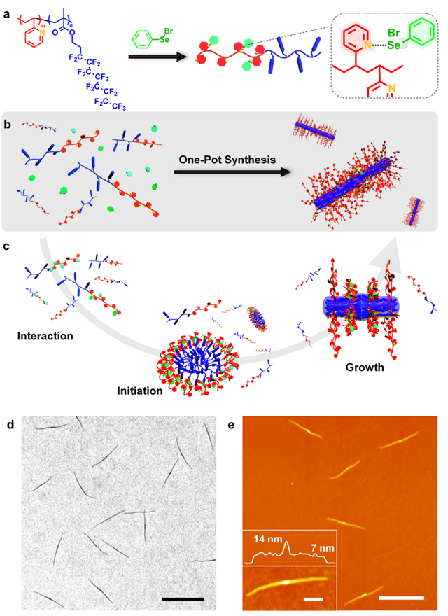 通過高效和通用的方法控制納米尺度粒子的組裝,同時對形貌和尺寸進行精確控制,歷來是材料科學及化學領域最吸引人及最具有挑戰的研究課題之一。近年來,超分子聚合領域的發展為設計和制備結構復雜、多功能性的人工結構提供了一個有趣的思路。其中,很多納米結構的合成及制備都是通過“引發-生長”機制(或者稱為“種子生長”)來實現的。然而,在大多數情況下,由于超分子相互作用的動態特質,這些基于非共價作用的超分子聚合物納米結構的穩定性較低,為其尺寸的精確控制和后續功能化帶來了難度。