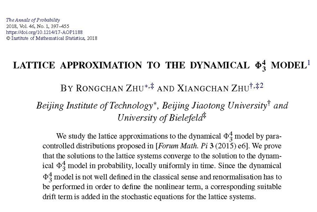場給出刻畫,相關工作發表于國際數學一流期刊在《Communication in mathematical physics》《Journal of functional analysis》等。這些結果受到Hairer、Gubinelli等數學家的高度關注。Gubinelli教授在2018國際數學家大會上引用了朱蓉禪副教授及其合作者的最新研究結果。