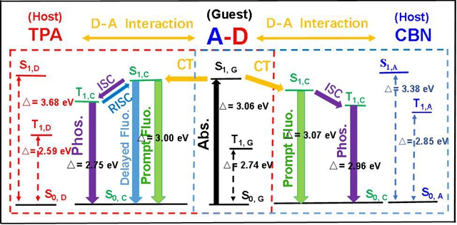 圖2 TPA/DOB和CBN/DOB摻雜材料的Jablonski圖。S1,D和T1,D表示TPA的單重態和三重態,S1,A和T1,A表示CBN的單重態和三重態,S1,G和T1,G表示客體分子(DOB ),S1,C和T1,C表示主體分子和客體分子之間形成的電荷轉移狀態的單重態和三重態。(圖片來自于ACS)