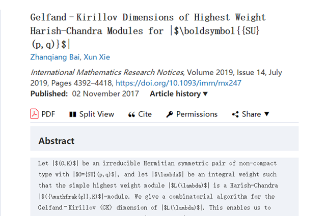 日前,北理工數學與統計學院謝迅副研究員在國際數學頂級學術期刊《International Mathematics Research Notices》上發表題為“Gelfand–Kirillov Dimensions of Highest Weight Harish-Chandra Modules for SU(p,q)”的研究論文。該論文給出了SU(p,q)的具有最高權的單模的Gelfand-Kirillov維數的一個算法。這個算法可以用來研究這些單模的Gelfand-Kirillov維數以及伴隨簇的一些性質。