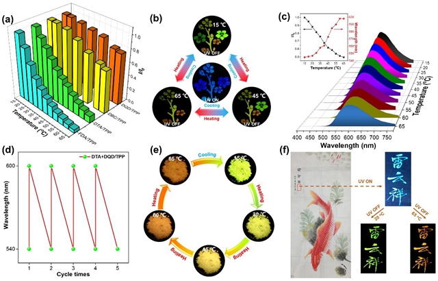 圖2.(a)主客體材料在15-65 oC溫度范圍內的原位磷光強度變化。(b)在不同溫度下去除激發源之前(中間)和之后的花朵照片。DTA-DQD/TPP摻雜材料(c)在不同溫度下的磷光波長和強度;(d)在四個循環中原位磷光波長變化;(e)在不同溫度下的磷光顏色變化;(f)在書法和藝術品防偽中的應用。