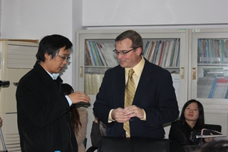 趙亞男副教授介紹了機械與車輛學院交通工程系的概況,并介紹了運輸及物流研究所承擔的國家自然科學基金委員會,重大研究計劃和重點支持項目“無人駕駛車輛智能行為綜合測試環境設計與測評體系研究”多個等重大項目。介紹了2013年11月2日-5日將在江蘇省常熟市舉辦的2013年中國智能車未來挑戰賽。James R.Sayer和鮑珊老師對中國智能車未來挑戰賽很感興趣,王建群教授和熊輝副教授分別向Dr. Sayer和鮑珊老師介紹了他們各自的研究領域和在研課題。