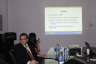 在學術交流中,James R. Sayer 對密歇根大學的研究歷史以及他所在的交通運輸研究所的研究內容做介紹;Dr. Jim Sayer介紹了他作為主任的人因工程研究中心的在研課題,主要包括交通事故的統計分析、Integrated Vehicle-Based Safety Systems (IVBSS) 和The Connected Vehicle Safety Pilot Program等,視頻演示了在行車過程中不同因素對于行車安全的影響。
