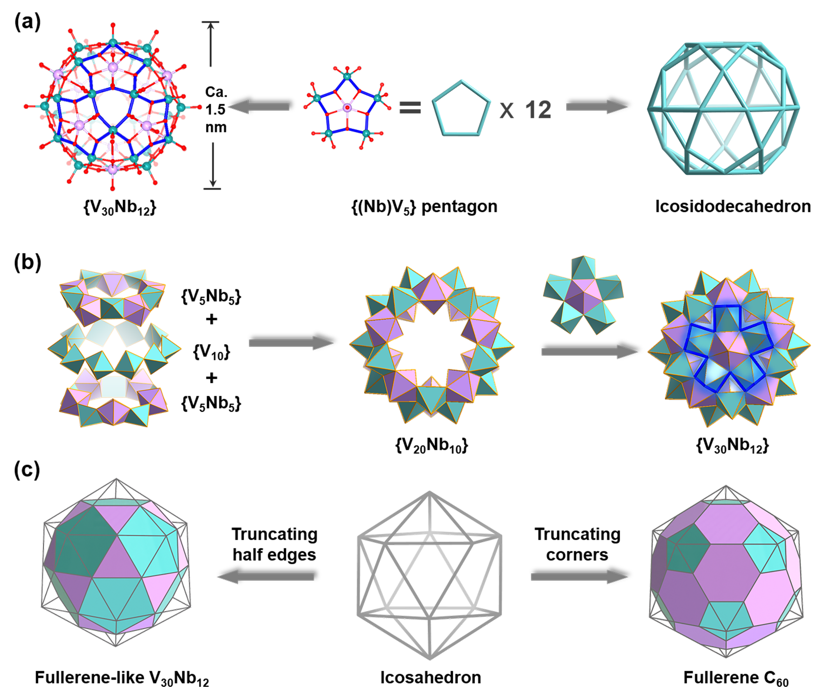 基于以上研究現狀,胡長文教授和遲瑛楠教授團隊首次在POV簇的合成中引入鈮源,調控Nb、V兩種原料的水解與聚合速率,利用鈮源水解產生的{NbO7}誘導生成異金屬{Nb(V5)}五角星構筑基元,制備了一例具有 I h 對稱性的純無機類富勒烯POV籠簇:K11Na4H3{(V2O)V30Nb12O12 (H2O)12}·37H2O(V30Nb12)。該化合物由12個{Nb(V5)}五角星構筑基元通過與5個相鄰的{Nb(V5)}五角星構筑基元共用V原子的方式連接而成。在類富勒烯V30Nb12中,30個V原子恰好位于截半二十面體的頂點上。從幾何角度上看,V30Nb12所在的截半二十面體和富勒烯C60所在的截角二十面體可看作一對兄弟,兩者都屬于阿基米德固體,都通過正十二面體截邊而形成。
