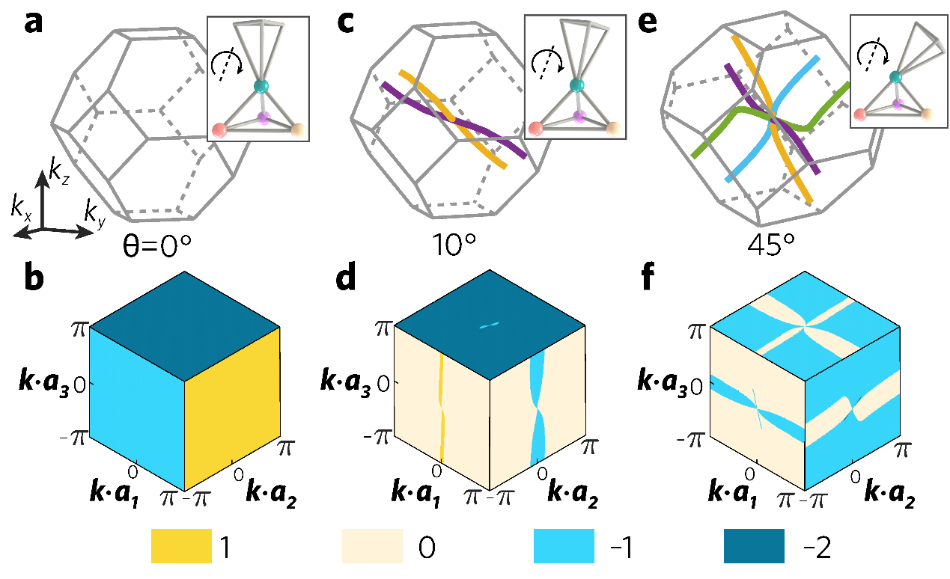 該團隊利用整體剪切變形模式,能夠在不重新組裝晶格模型的情況下改變晶格的幾何參數,進而使得3D打印的廣義焦綠石晶格可以簡便地在完全拓撲極化相和外爾相之間相互轉變。圖2 (a,c,e)展示了廣義焦綠石晶格在一個整體剪切模式中達到的三種不同拓撲相,分別是完全拓撲極化相(a)、具有兩條外爾線的外爾相(c)和具有四條外爾線的外爾相(e)。如圖2(b)所示,完全拓撲極化相在整個布里淵區具有相同的拓撲極化矢量,與此相對的,外爾相的拓撲極化矢量則依賴于具體的布里淵區中波矢的選擇。