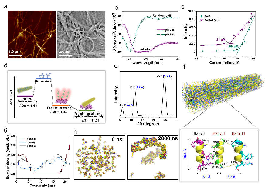 進一步的,通過使用AFM、TEM、CD、XRD及分子動力學模擬等手段對TAP自組裝行為進行了研究。證明了其可在腫瘤微環境中能夠轉變成α-helix結構,并通過對PD-L1的特異性識別和招募下以極低的濃度進行快速組裝。