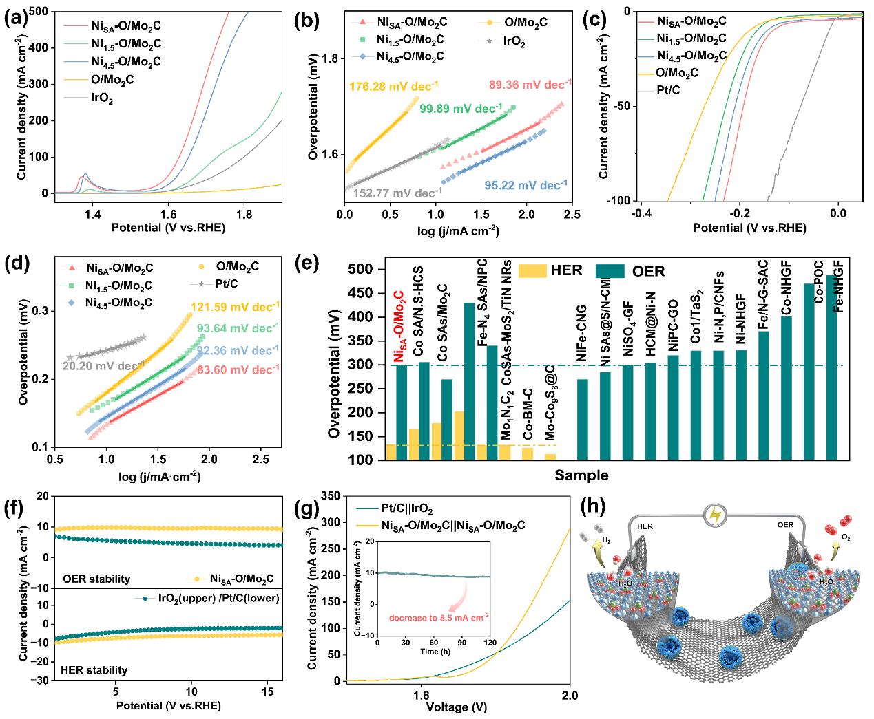 圖3. 與O/Mo2C,Ni1.5-O/Mo2C以及Ni4.5-O/Mo2C相比下NiSA-O/Mo2C的電化學性能表征。