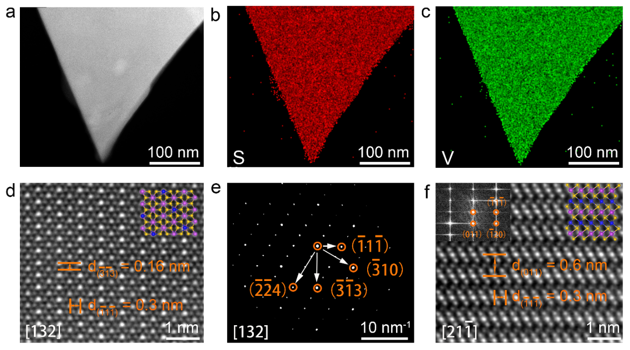 圖4. 二維 V3S5的STEM表征。(a)V3S5晶體的TEM圖像及S(b)和V(c)元素TEM-EDS mapping。(d)V3S5晶體STEM-HAADF圖像。(e)V3S5晶體電子衍射花樣。(f)V3S5晶體的截面STEM-HAADF圖像。