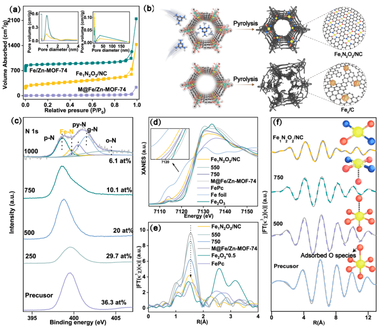圖2. 通過N2吸脫附等溫線,XPS、同步輻射對Fe1N2O2/NC的形成展開分析。