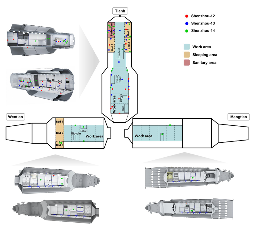 在軌空間站艙內有很多背板狹縫區域是航天員的“不可及”區域,常爆發微生物卻很難被清理到,所以是在軌空間站的微生物防控工作應給予關注的重點區域。該論文首次全面研究了建造期在軌中國空間站中“不可及”區域的微生物的來源、數量豐度及群落演替規律。神舟12到神舟14乘組在軌執行任務期間,協助研究項目組在核心艙、夢天實驗艙和問天實驗艙的工作區、衛生區和睡眠區總共采集了50個在軌微生物樣品。研究分析了這些區域的可培養及全部微生物污染數量范圍以及高豐度的微生物種類。結果表明,乳酸桿菌作為一種人體益生菌廣泛分布于艙內所有區域,艙內不存在強致病菌但存在多種條件致病菌。艙內沒有糞便源微生物污染,所有微生物有58.8%來源于航天員的皮膚及口腔,艙內所有區域的微生物污染類群會隨乘組更替發生顯著性變化,天和核心艙的生物標志物是一株來源于植物的寡養單胞菌。所有結果一定程度指示著,在軌中國空間站后期微生物安全防控工作可以在人源和植物源的微生物的污染方面加大防控力度,尤其是在軌開展相關植物培養實驗過程中應盡量控制根際土壤微生物擴散到艙內空氣和航材表面等。