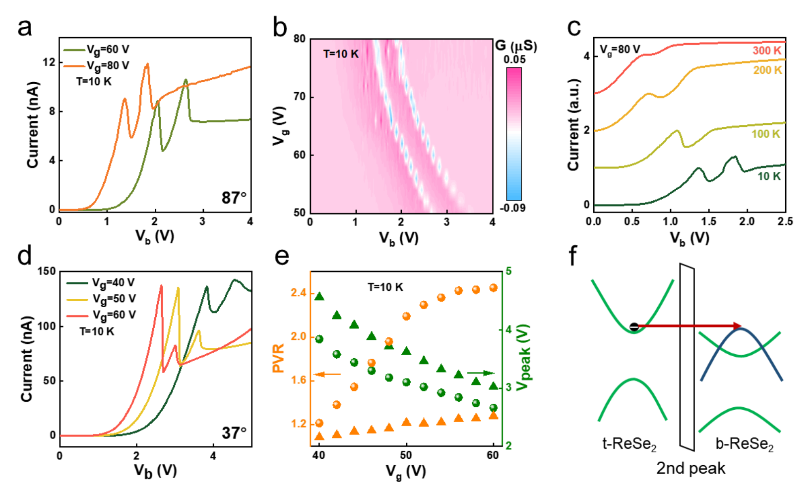 圖3展示了扭曲堆疊共振隧穿晶體管中的雙重負微分電阻峰。圖a-c展示了87° TS-RTT中雙重負微分電阻峰對柵電壓和溫度的響應。圖d-e展示了37° 扭曲堆疊共振隧穿晶體管中雙重負微分電阻峰和雙重PVR對柵電壓的響應。圖f展示了能帶對準的示意圖,解釋了雙重負微分電阻峰的來源。