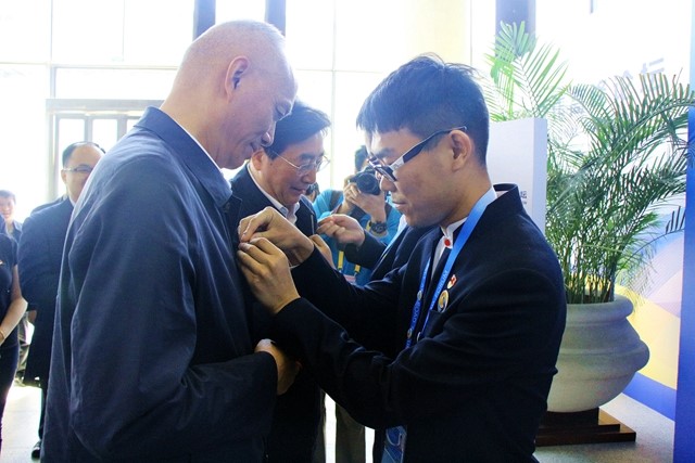 “一帶一路”志愿者的辛勤付出也受到校內(nèi)外各界的關(guān)注與關(guān)懷。5月13日上午,北京市委書記郭金龍,市長(zhǎng)蔡奇一行來到各志愿者崗位親切看望了志愿者,并表示志愿者們代表中國(guó)形象、北京形象、青年形象。在注冊(cè)中心,志愿者們向北京市領(lǐng)導(dǎo)演示論壇參會(huì)人員的注冊(cè)流程,我校于增雨同學(xué)代表志愿者為蔡奇市長(zhǎng)佩戴了志愿者徽標(biāo)。