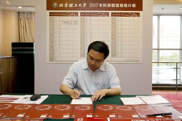 胡海巖審閱了今年錄取通知書、招生錄取工作手冊、報考指南、宣傳海報、各省宣傳單頁等資料,對學校本科招生細致的宣傳工作和規(guī)范的錄取工作程序給予了充分肯定。為表達學校對人才培養(yǎng)的高度重視,歡迎和激勵廣大優(yōu)秀學子報考我校,胡海巖現(xiàn)場為我校待錄取的各省份文、理科最高分考生親手簽發(fā)了錄取通知書,并提議部分優(yōu)秀新生可由各招生組老師親自聯(lián)系并將錄取通知書送至其手中,增進新生對學校的感情。在錄取現(xiàn)場,胡海巖查看了普通一批已經(jīng)投檔省份的生源情況,查閱了部分考生的檔案。
