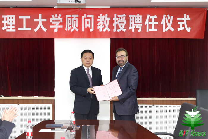 自動(dòng)化學(xué)院院長(zhǎng)夏元清教授介紹了Giannakis教授在科學(xué)研究領(lǐng)域取得的杰出成就。Giannakis教授是IEEE Fellow和EURASIP Fellow,其H-index高達(dá)127,獲得了包括IEEE G. Marconi Prize Paper Award在內(nèi)的8項(xiàng)最佳論文獎(jiǎng)。校長(zhǎng)胡海巖院士代表學(xué)校向Giannakis教授頒發(fā)了北京理工大學(xué)顧問(wèn)教授聘書(shū)。Giannakis教授發(fā)言表示他非常榮幸受聘為北京理工大學(xué)顧問(wèn)教授,介紹了他與自動(dòng)化學(xué)院陳杰教授科研合作與聯(lián)合人才培養(yǎng)的情況,并希望以此為契機(jī)進(jìn)一步加強(qiáng)美國(guó)明尼蘇達(dá)大學(xué)與我校的更深層次的交流與合作。校長(zhǎng)胡海巖院士最后發(fā)表了講話,他首先對(duì)Giannakis教授受聘為北京理工大學(xué)顧問(wèn)教授表示熱烈的祝賀。同時(shí)胡海巖校長(zhǎng)指出,北京理工大學(xué)入選了“雙一流”高校,控制科學(xué)與工程學(xué)科入選了“雙一流”學(xué)科,希望與Giannakis教授在“雙一流”建設(shè)、科學(xué)研究、人才培養(yǎng)等方面進(jìn)一步加強(qiáng)合作,取得更加豐碩的成果。