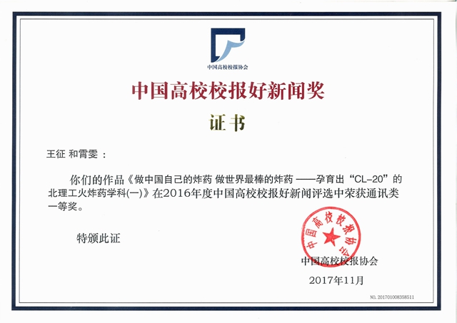 編輯:馬瑤 審核:王征 閱讀次數:11月26至28日,中國高校校報協會2017年年會暨第二屆中國高校傳媒發展高端論壇在成都舉辦,本屆論壇以“新時代中國高校傳媒的創新與堅守”為主題。論壇上揭曉了2016年度“中國高校校報好新聞”評選結果,我校校報榮獲佳績。其中,《做中國自己的炸藥,做世界最棒的炸藥——孕育出“CL-20”的北理工火炸藥學科》榮獲通訊類一等獎,《我與祖國航天事業共成長》榮獲版面類二等獎,《北理工瞬間:國防生軍事體育運動會上的颯爽英姿》榮獲新聞攝影類三等獎。