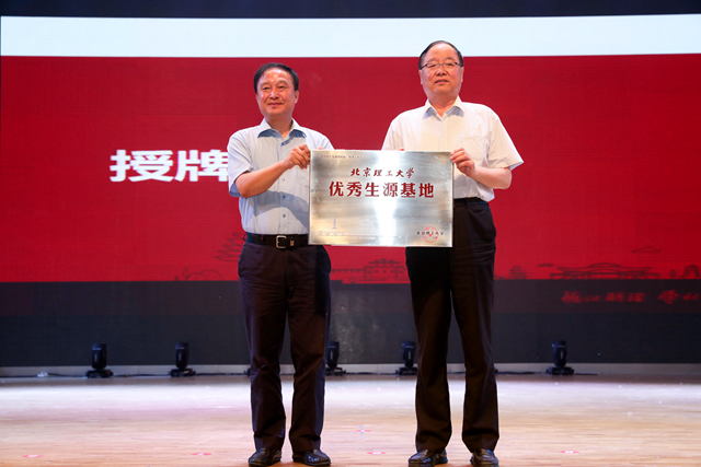 王曉鋒代表北京理工大學授予衡水中學“優秀生源基地”,并贈送由北理工主要參與研制的99A主戰坦克模型。