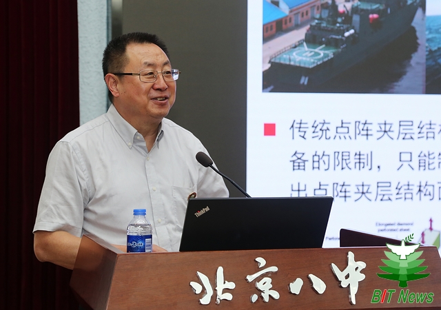 方岱寧院士結合當下科學技術熱點,面向高一全體學生,運用深入淺出的語言,從“研究背景、基于增材制造的輕量化多功能一體化材料與結構設計、先進增材制造手段與裝備研發、輕量化多功能一體化材料與結構增材制造、4D增材制造技術、總結與展望”等六個方面作學科專題講座。同時,他結合自己的求學與科研工作經歷,表達了對我國科技事業和國防事業的深厚感情,強調科學發現和技術革新對于國家發展的重要貢獻。他鼓勵在場學生樹立遠大理想,希望與北京八中優秀學子日后相聚北理,為實現科技報國貢獻一份力量。