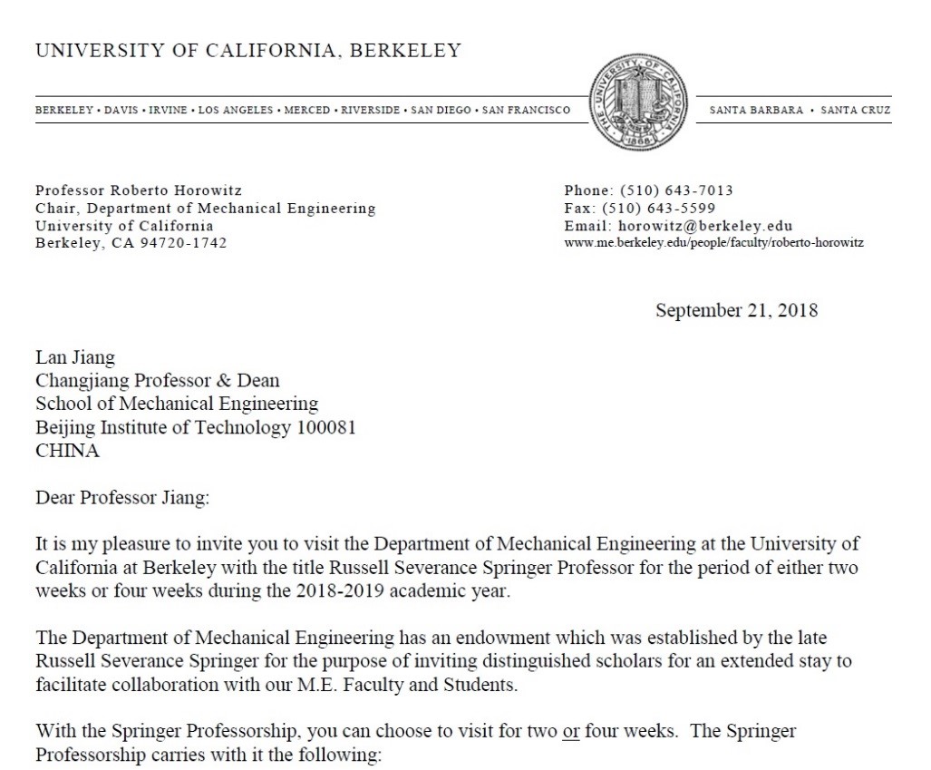 近日,北理工機械與車輛學院姜瀾教授入選美國加州大學伯克利分校Russell Severance Springer Professor(榮譽性質的杰出教授職位)。Russell Severance Springer Professor 每年全球遴選3人,要求被提名人必須為非常杰出的學者(The nominee must be a scholar of truly eminent stature)。該榮譽職位自1964年開始授予,54年內全球有149人入選,姜瀾教授為中國大陸地區的第二名入選學者。