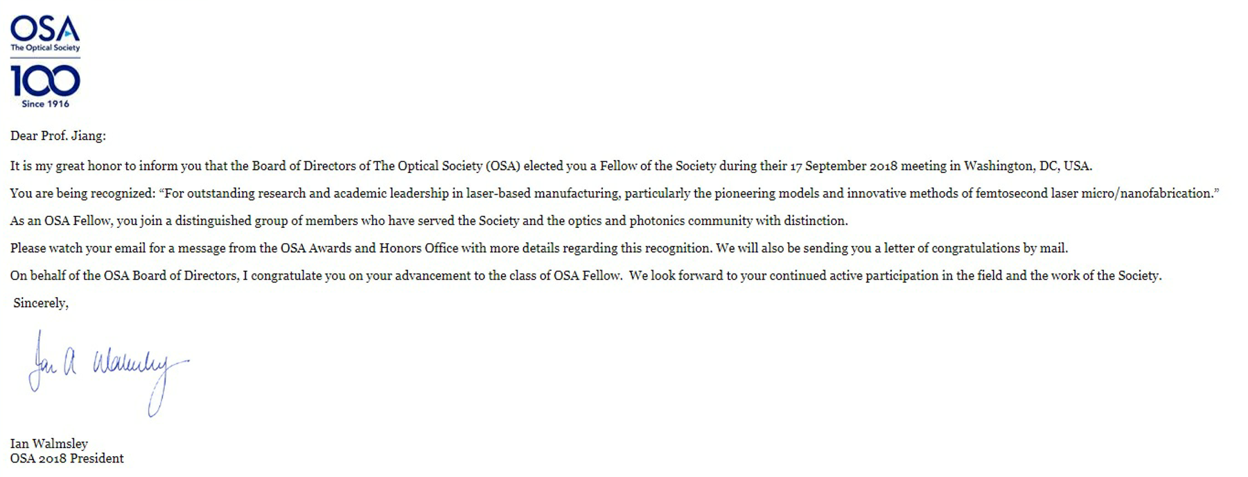 此外,姜瀾教授近期當選美國光學學會會士(OSA Fellow)。美國光學學會在姜瀾教授當選理由中解釋是由于其“在激光制造領域的杰出研究成果和學術領袖地位,特別是飛秒激光微/納加工的開創性工作。(For outstanding research and aca-demic leadership in laser-based manufacturing, particularly the pioneering work of femtosecond laser micro/nanofabrication.)” 這是繼美國機械工程學會會士(ASME Fellow)和國際納米制造學會會士(ISNM Fellow)之后姜瀾教授當選的第三個國際學會會士。
