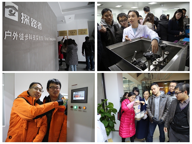 三校老師先后對探路者產品研發中心實驗室、文化展、樣品間等進行了參觀。老師們認真聆聽實驗員的講解,親身體驗恒溫恒濕測試、耐折試驗、極地環境測試等,切身感受民族品牌在自主研發過程中的執著與堅守。