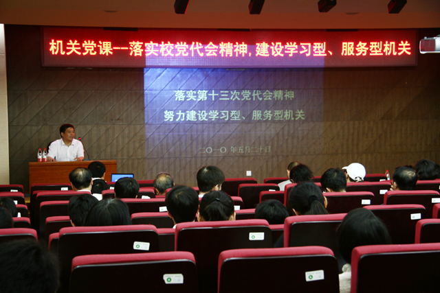 5月21日,校黨委副書記侯光明在圖書館報告廳為機關黨員講了一堂題為《落實第十三次黨代會精神 努力建設學習型、服務型機關》的黨課,機關各黨支部120余名黨員參加,會議由機關黨委書記楊惠萍主持。這是進一步深入宣傳校第十三次黨代會精神,在機關黨委所轄各黨支部率先開展爭創學習型黨組織活動的具體舉措。
